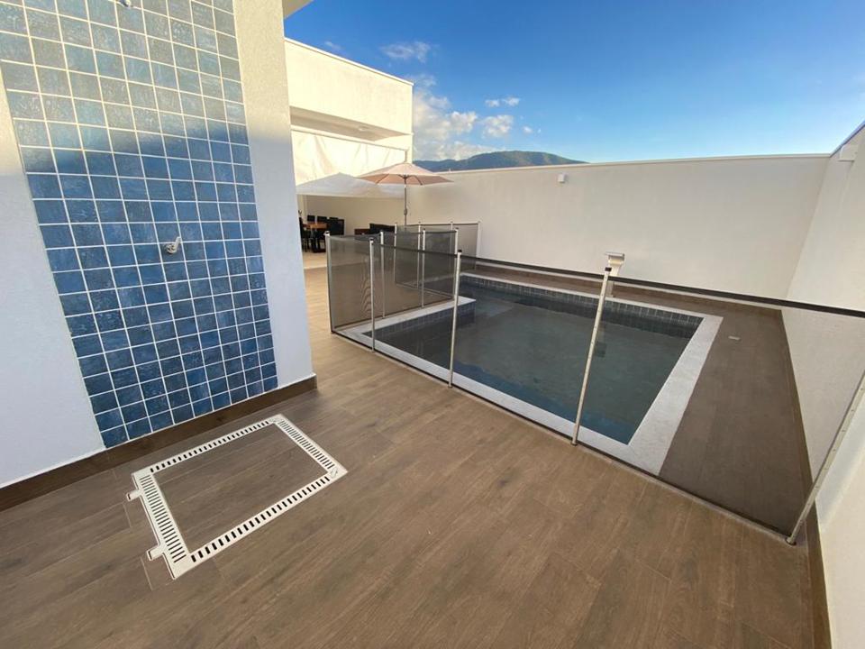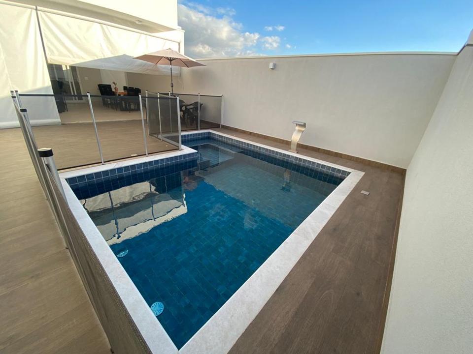 Área gourmet com churrasqueira, pia, forno embutido e amplo quintal com jardim e piscina com prainha.